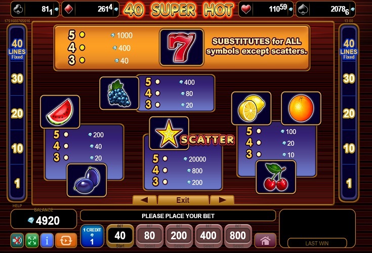 Du kannst 40 Super Hot gratis in jedem Online Casino spielen, um so die Gewinnchancen in diesem Slot zu testen und festzustellen, ob diese Slotmaschine etwas für dich ist. Das ist nicht nur bei 40 Super Hot der Fall, sondern du kannst oft viele Automatenspiele kostenlos testen und Dir eine kleine Strategie zurechtlegen.