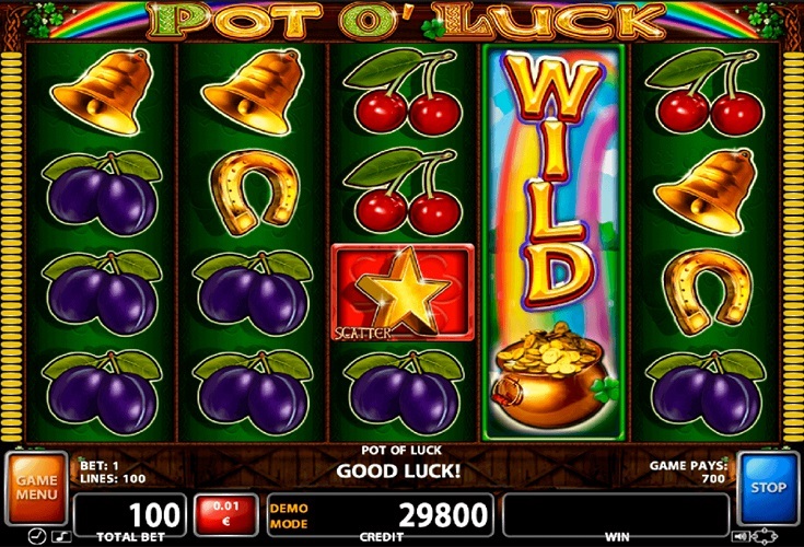 Der Pot of Luck Online Slot verfügt sowohl über Wilds (wilde Symbole) als auch über Scatter Symbole, die zu attraktiven Gewinnen führen können. Die klassischen Symbole sind Kirschen, Äpfel, Trauben, Pflaumen, eine Dollar-Münze, eine goldene Glocke sowie ein goldenes Hufeisen. Alle Symbole haben das Potenzial, abhängig von der Gewinnkombination, Auszahlungen in Höhe von 500 Münzen zu veranlassen. Zu dem am besten bezahlten regulären Symbol gehört 7.