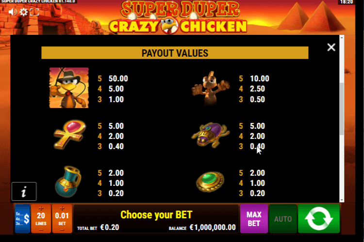 Auch wenn die Hühner in diesem Slot ganz eindeutig ein wenig verrückt sind, denn was würden Sie sonst auch in einer ägyptischen Wüste zu suchen haben, die Bedienung des Spielautomaten ist einfach, das gesamte Spielerlebnis unterhaltsam und ausbalanciert.